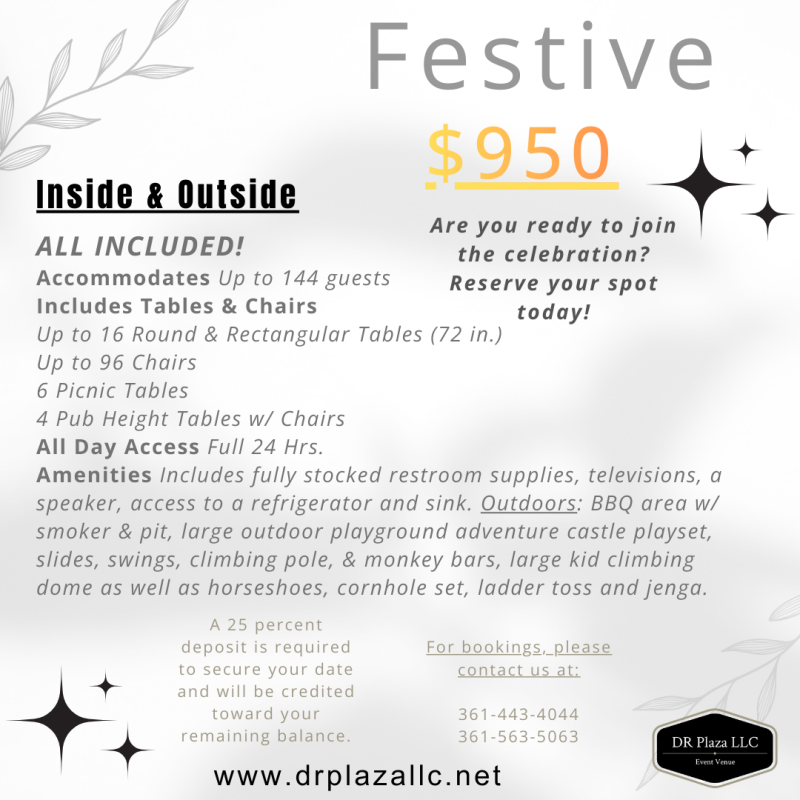 D R Plaza LLC is a locally owned venue located in Taft, Texas, United States. We founded D R Plaza LLC because we wanted to provide Taft and the surrounding areas with a beautiful, comfortable, but affordable event center. We take great pride in being owners and operators of our small business. This space has provided us with the opportunity to make new friends and hear the wonderful stories the building has, from renovation to finish. We cherish each and every event we have with our loved ones, and we want our guests to do the same. Whether it’s a wedding, birthday celebration, baby shower, a corporate event, or special occasion, we want to make sure your event is as special as you envisioned it. We live each day grateful for this opportunity.