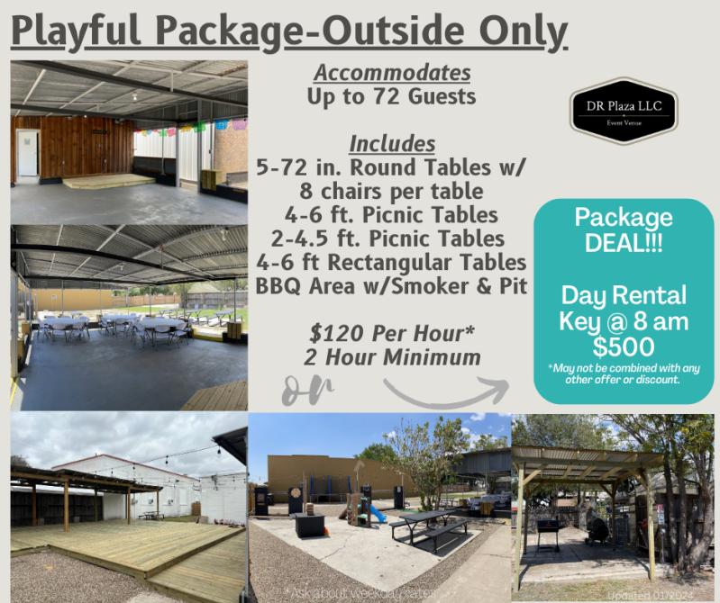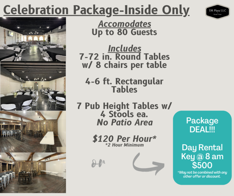 We offer plans to accommodate you indoor, or have an indoor/outdoor gathering. At D R Plaza LLC, we offer the space with an emphasis on quality and attention to detail. We will work with you to get you the space that that is meets your needs and budget.