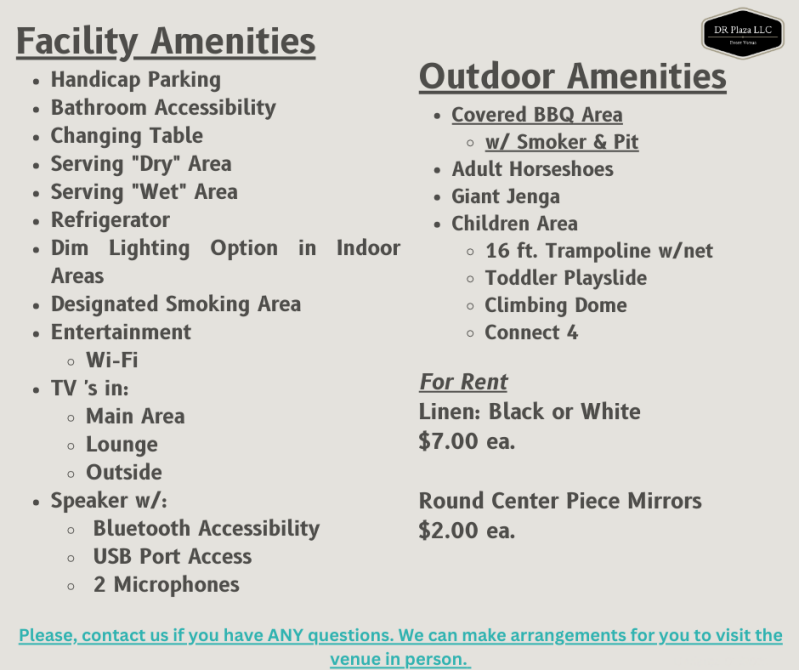 Discover the amenities offered at D R Plaza LLC for your next event. Explore the amenities we provide with our rental packages below.